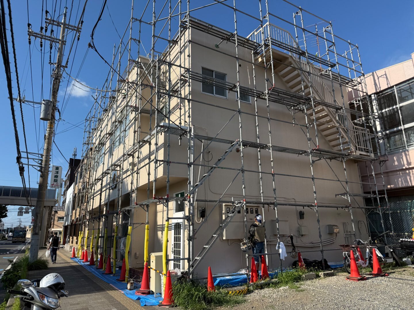 本日は、明日台風が接近するとのことで事故防止の為に足場のネット養生を外してまいりました。